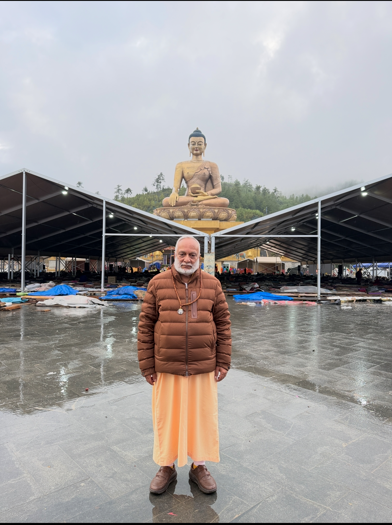 After the second day of the CBS conference, (Science, Mindfulness, and Meditation conference in Thimpu Bhutan), all I wanted was rest. It had been raining all evening, and me along with other 4 fellow sannyasi were cold, tired, and quiet. But as we drove through Thimphu’s winding roads, I spotted a golden glow in the distance—a massive sitting Buddha shining through the mist.